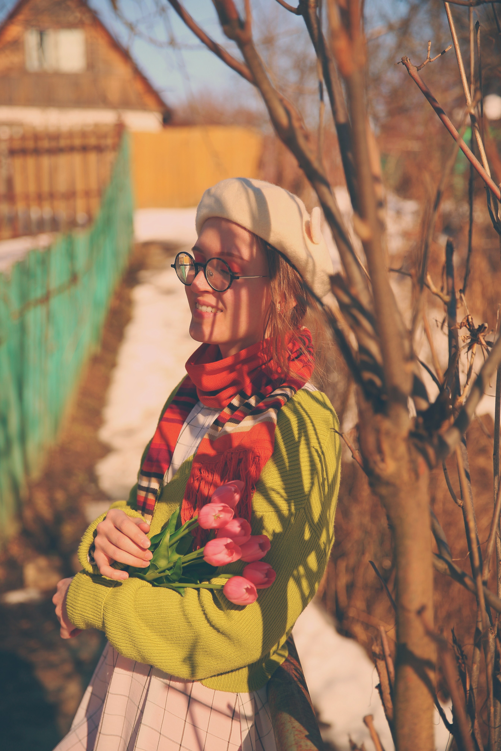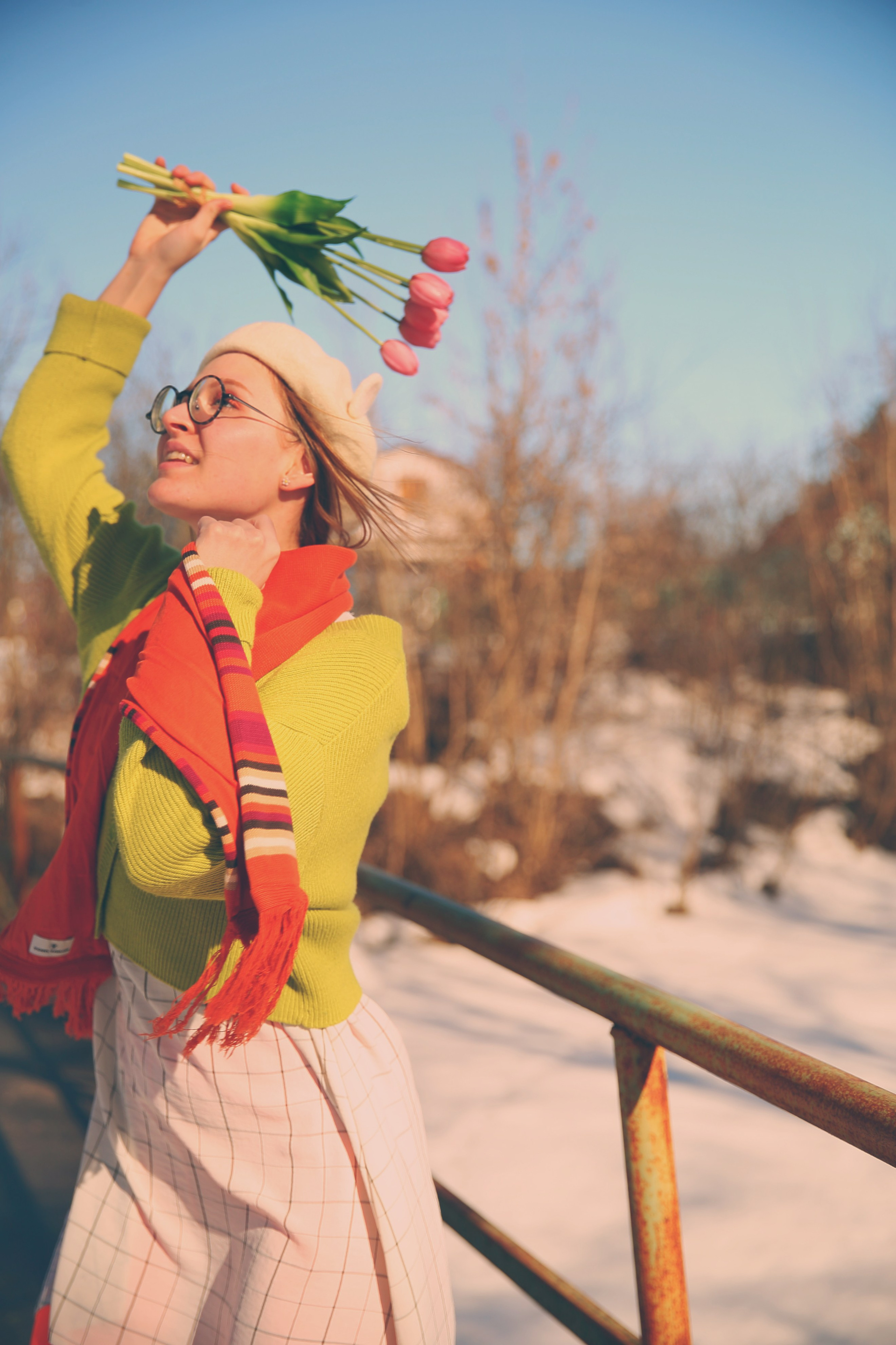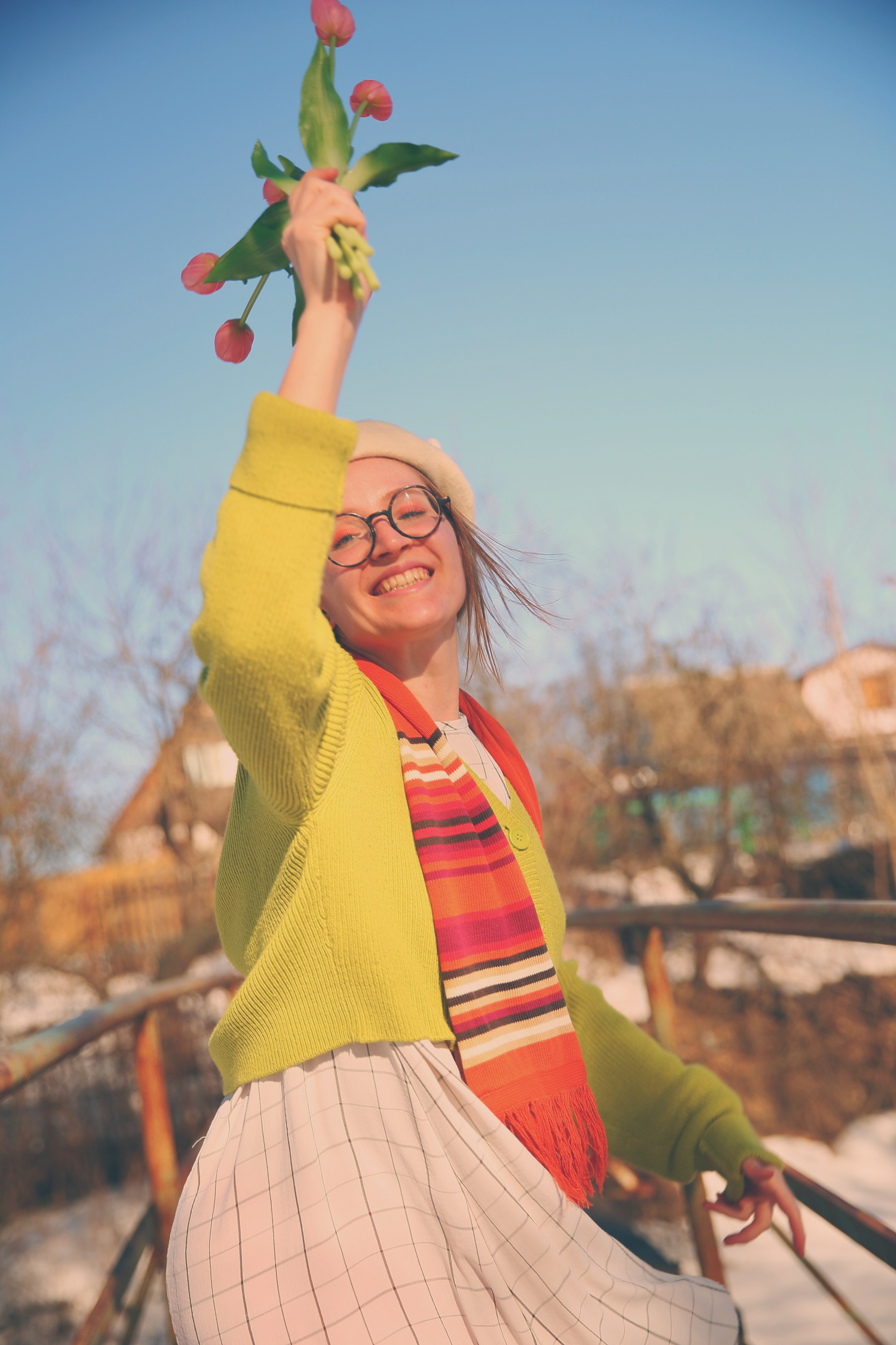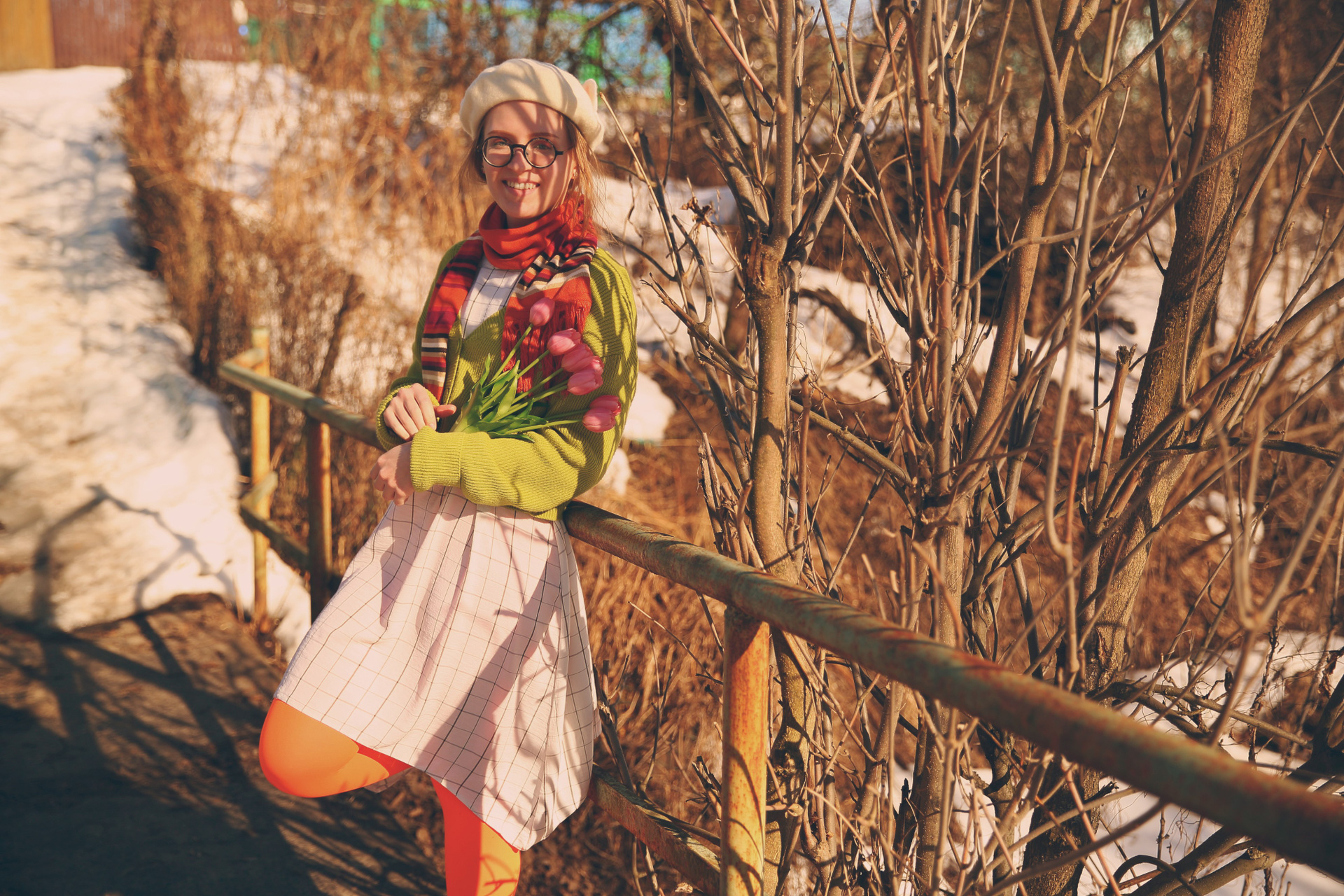 Обожаю эти моменты межсезонья, когда можно собрать в кадре всё самое нелогичное. Её улыбка теплее, чем требует погода, одежда громче, чем шепчет природа, а цветы — настоящий акт визуального бунта.