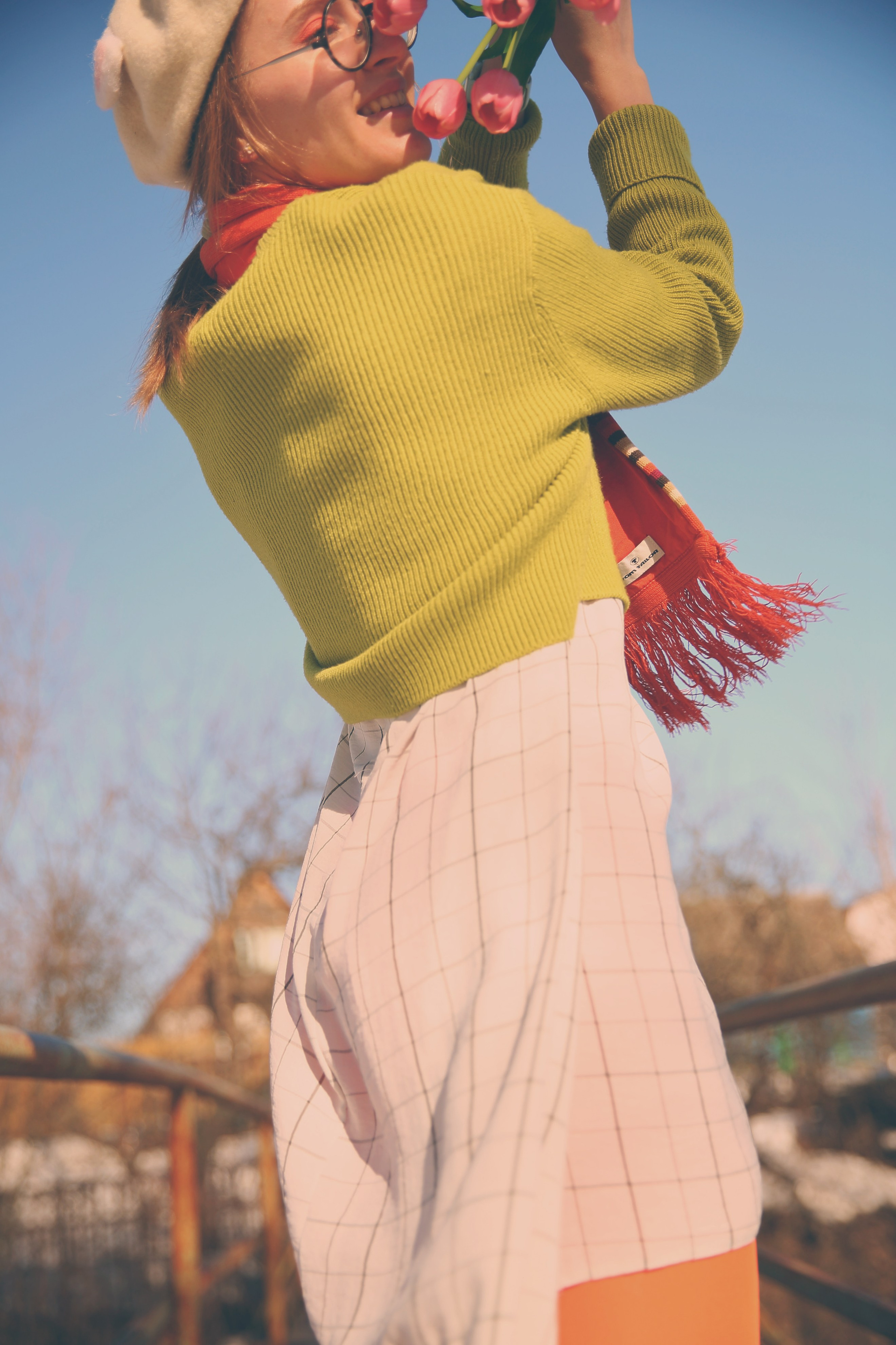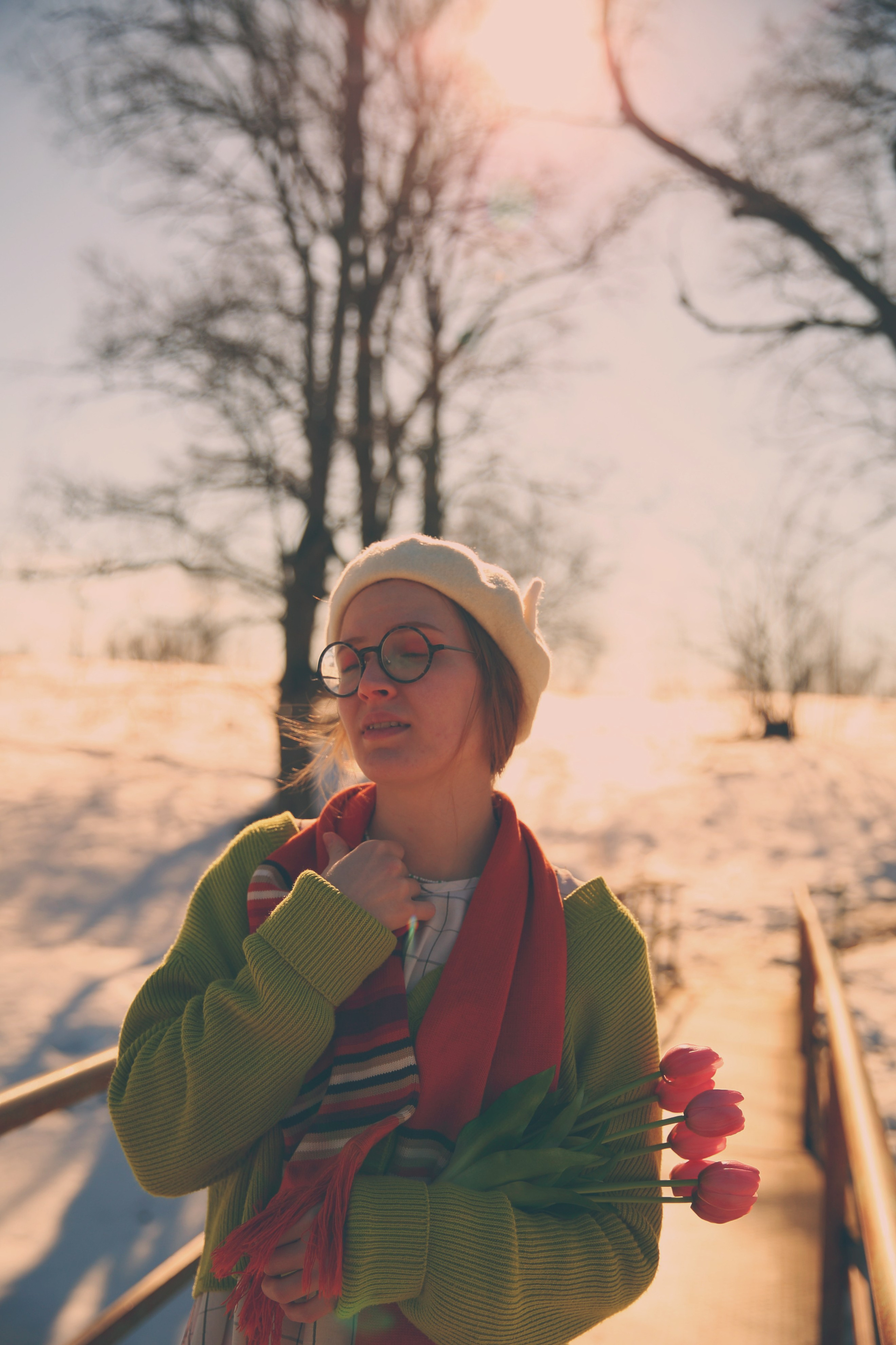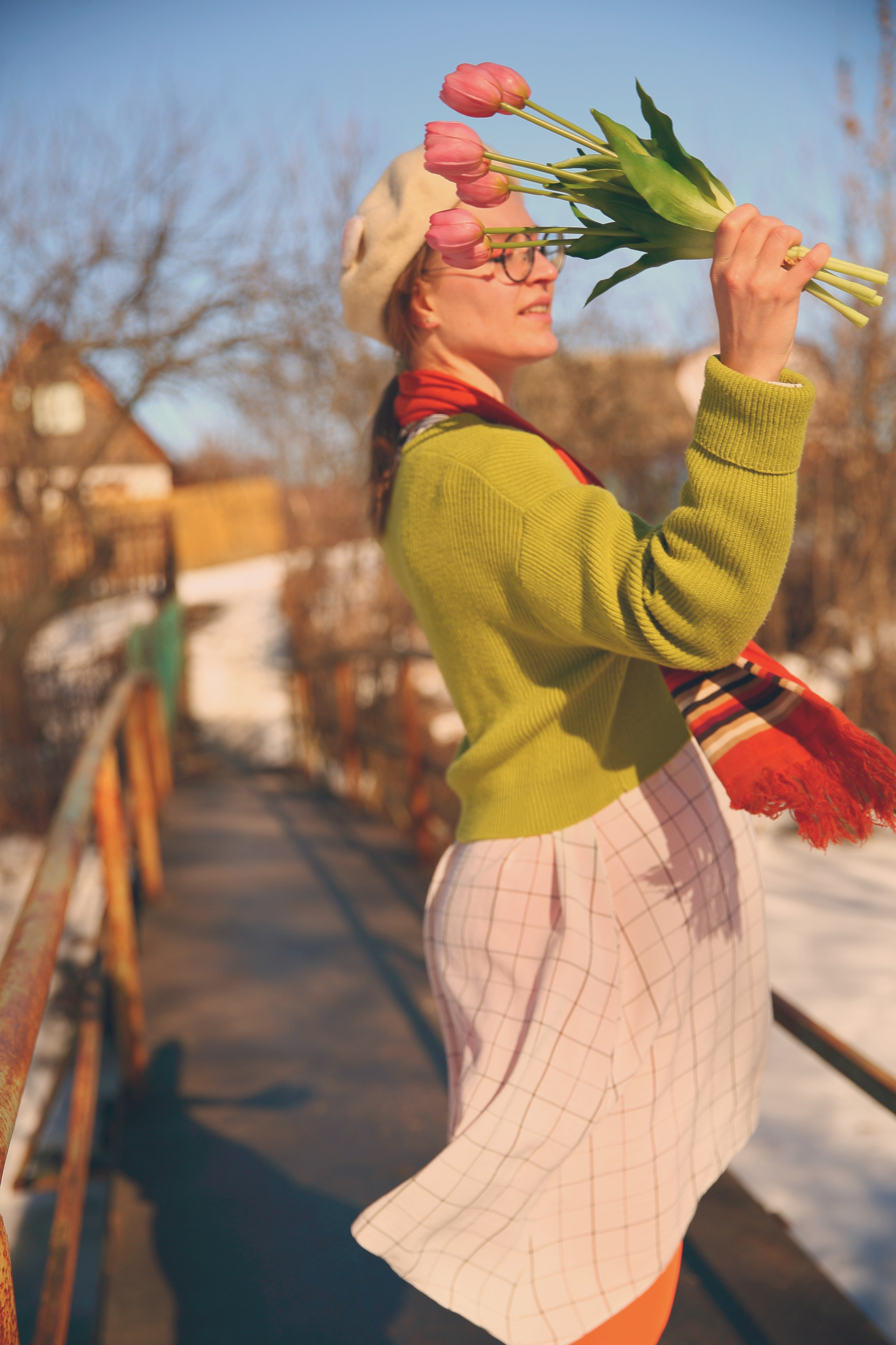 Обожаю эти моменты межсезонья, когда можно собрать в кадре всё самое нелогичное. Её улыбка теплее, чем требует погода, одежда громче, чем шепчет природа, а цветы — настоящий акт визуального бунта.