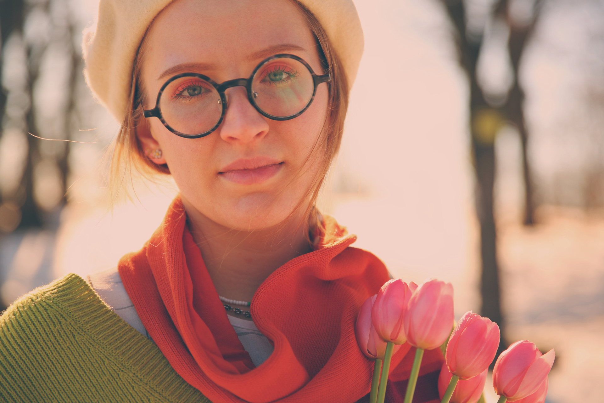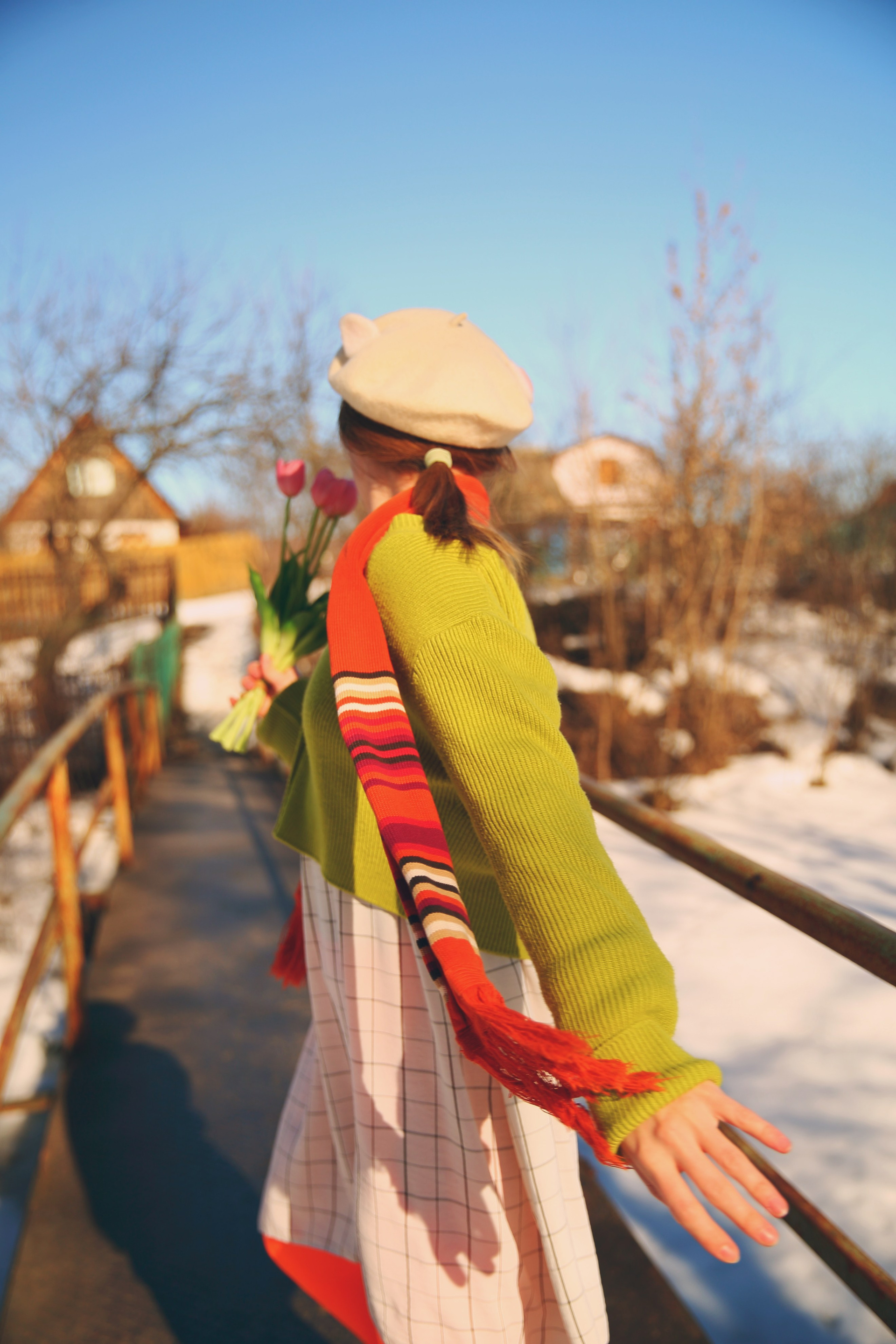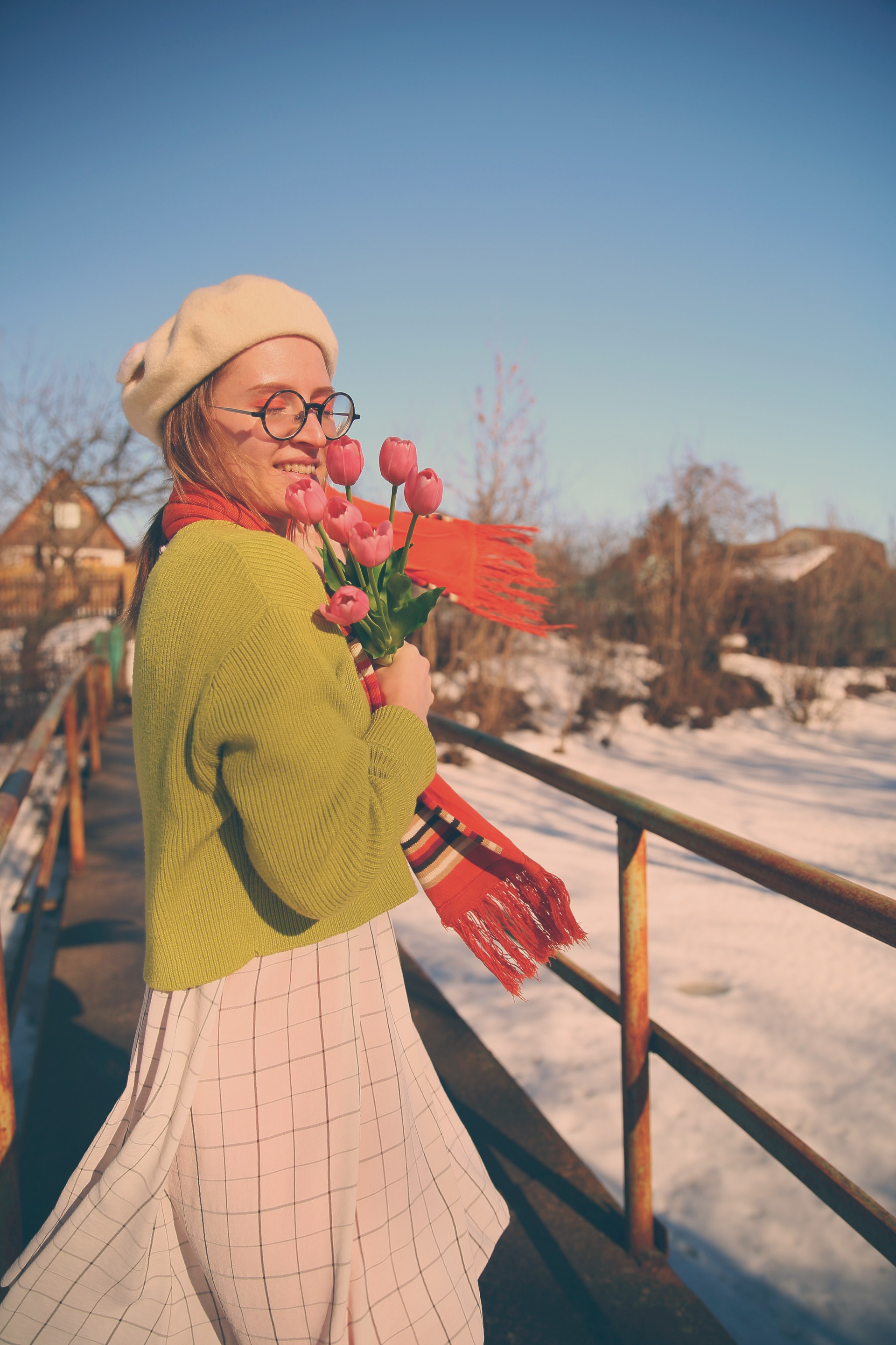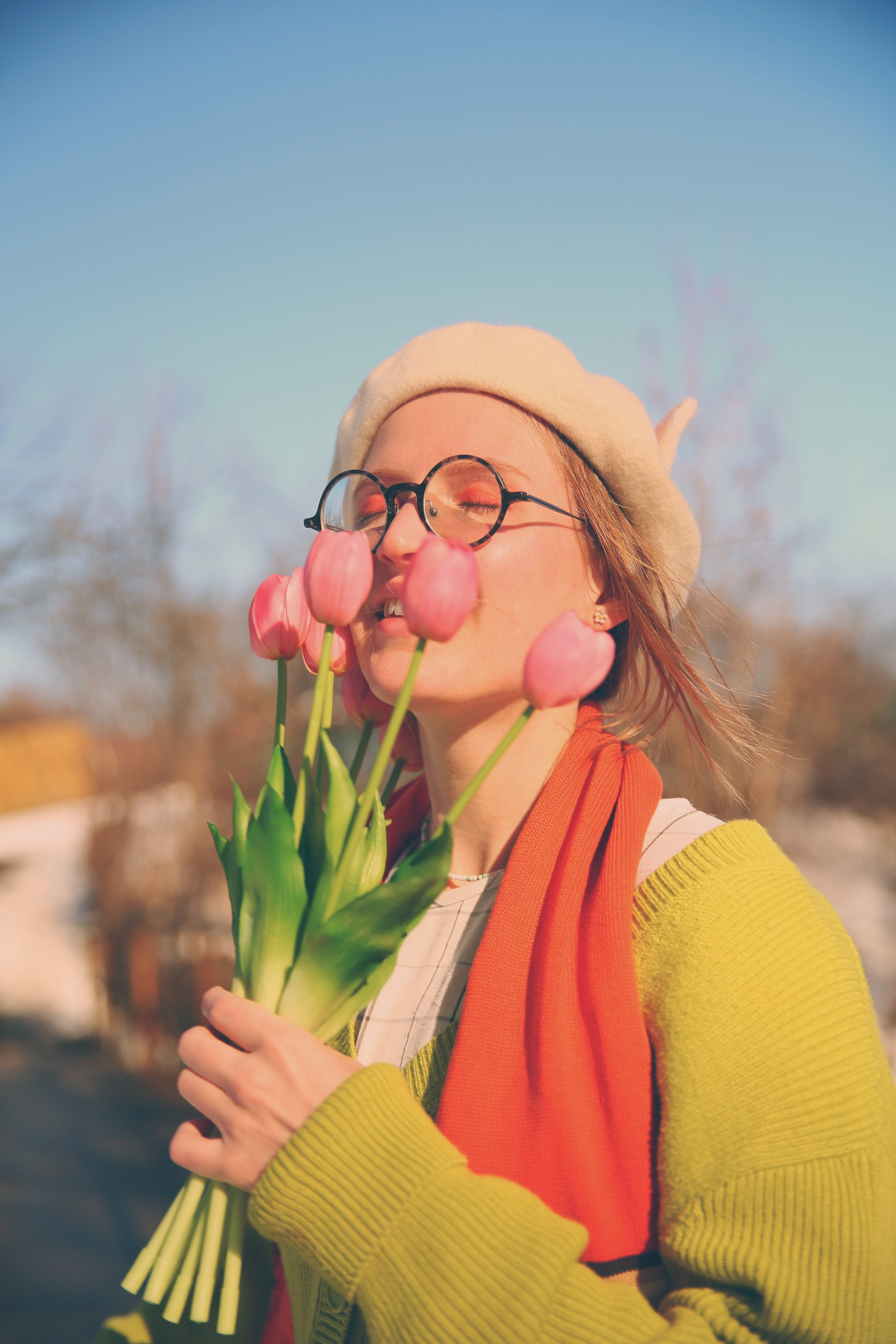 Обожаю эти моменты межсезонья, когда можно собрать в кадре всё самое нелогичное. Её улыбка теплее, чем требует погода, одежда громче, чем шепчет природа, а цветы — настоящий акт визуального бунта.